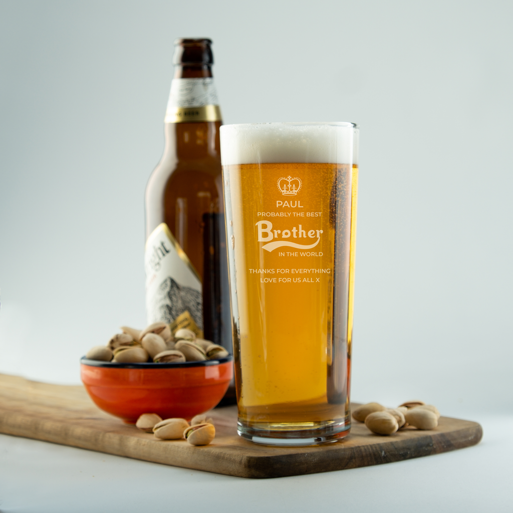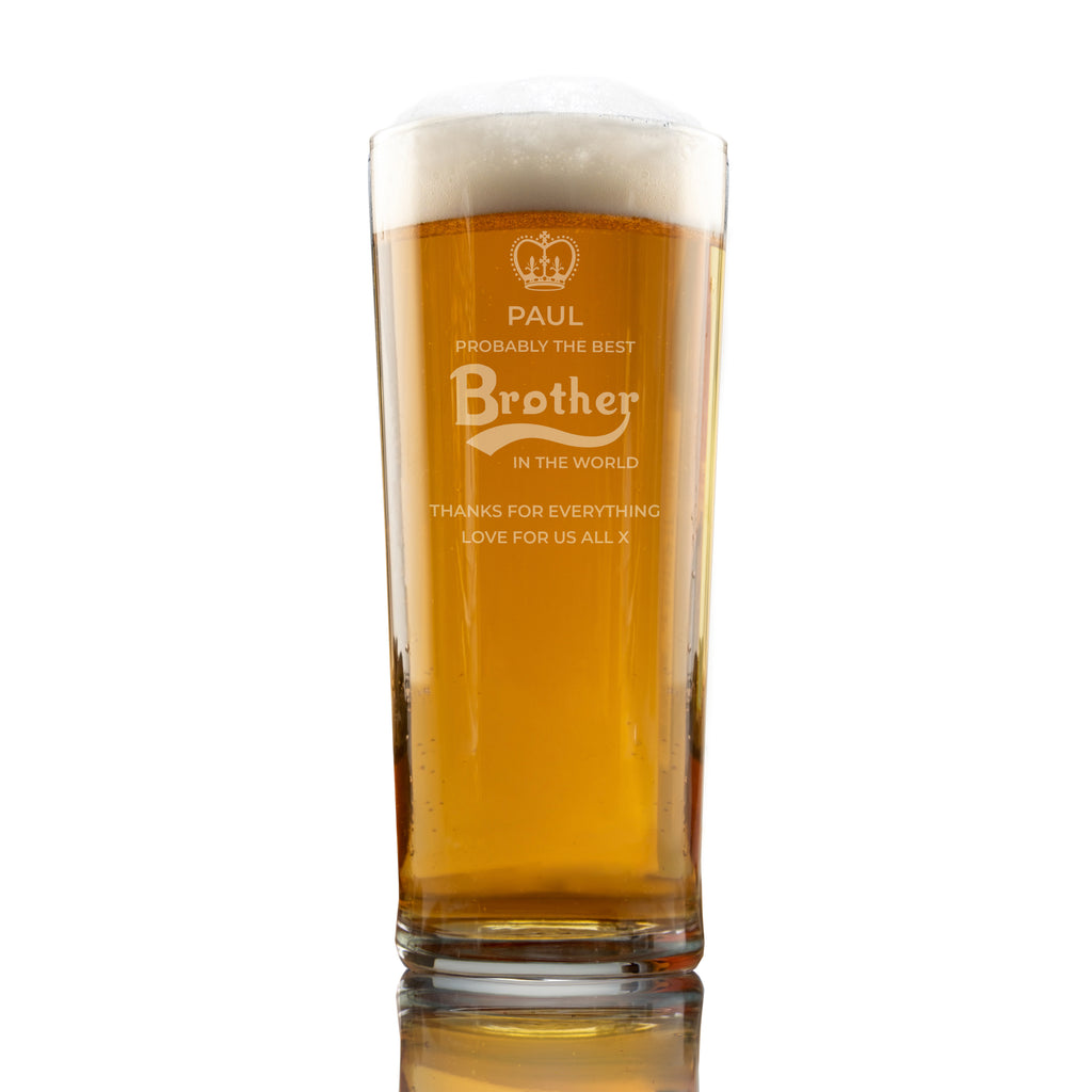 Introducing our "Probably The Best Brother In The World" larger themed personalised glass. This design is available engraved onto a pint glass or a tankard glass, making it a perfect choice for larger and beer drinkers alike.