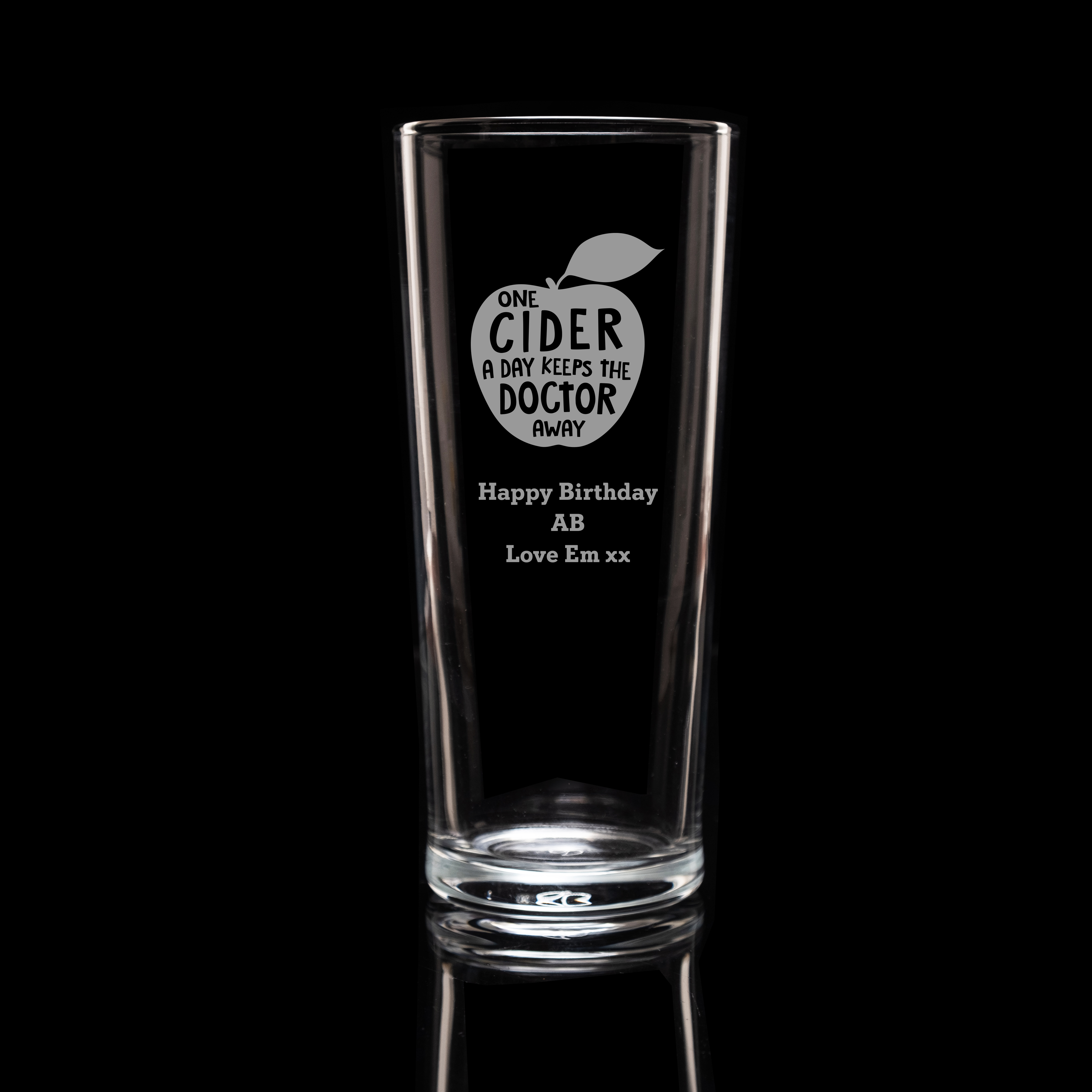 Cider a day design: With bold apple shaped "One Cider a day keeps the doctor away" design this glass is suitable for any cider fan. Whether traditional apple cider is their favourite or mixed fruit cider is their thing, this glass is sure to bring a smile everyday its used.