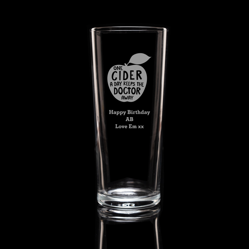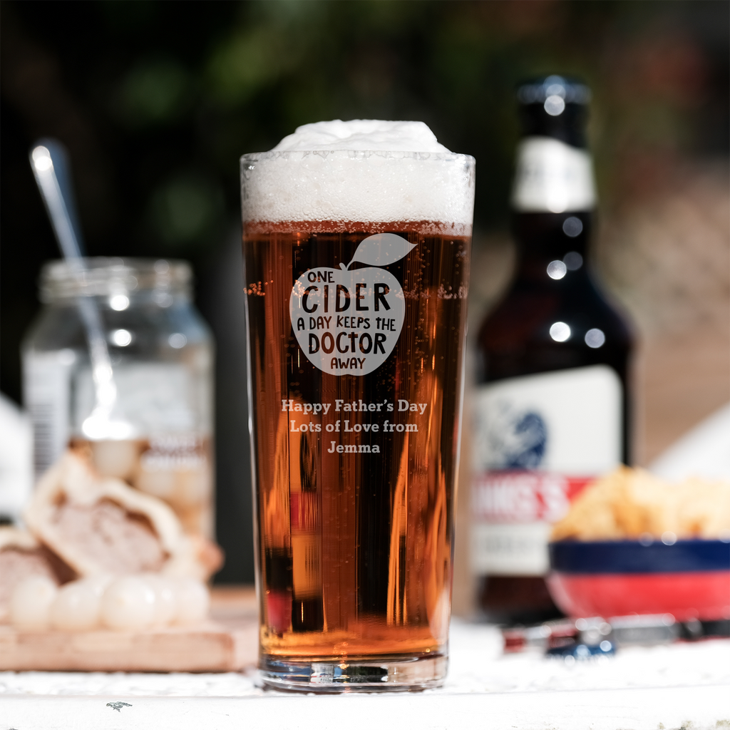 This "One Cider a day keeps the doctor away" engraved pint glass is a fantastic personalised gift idea for any cider drinker.