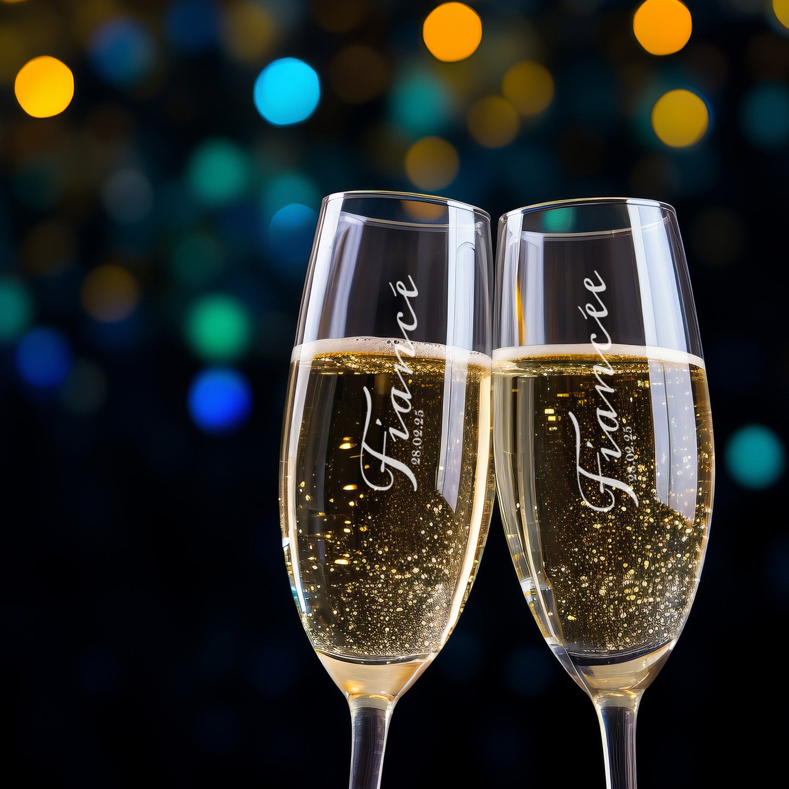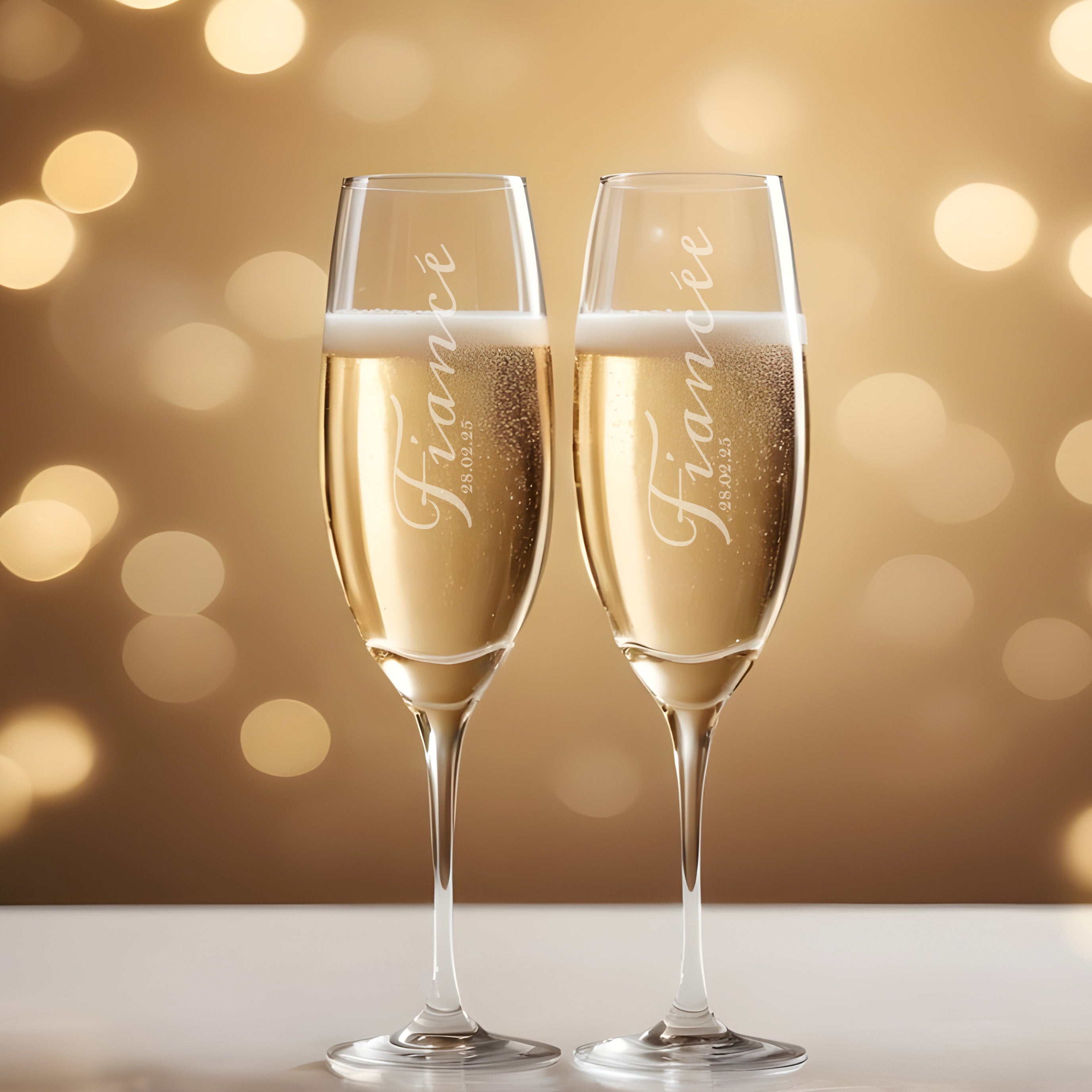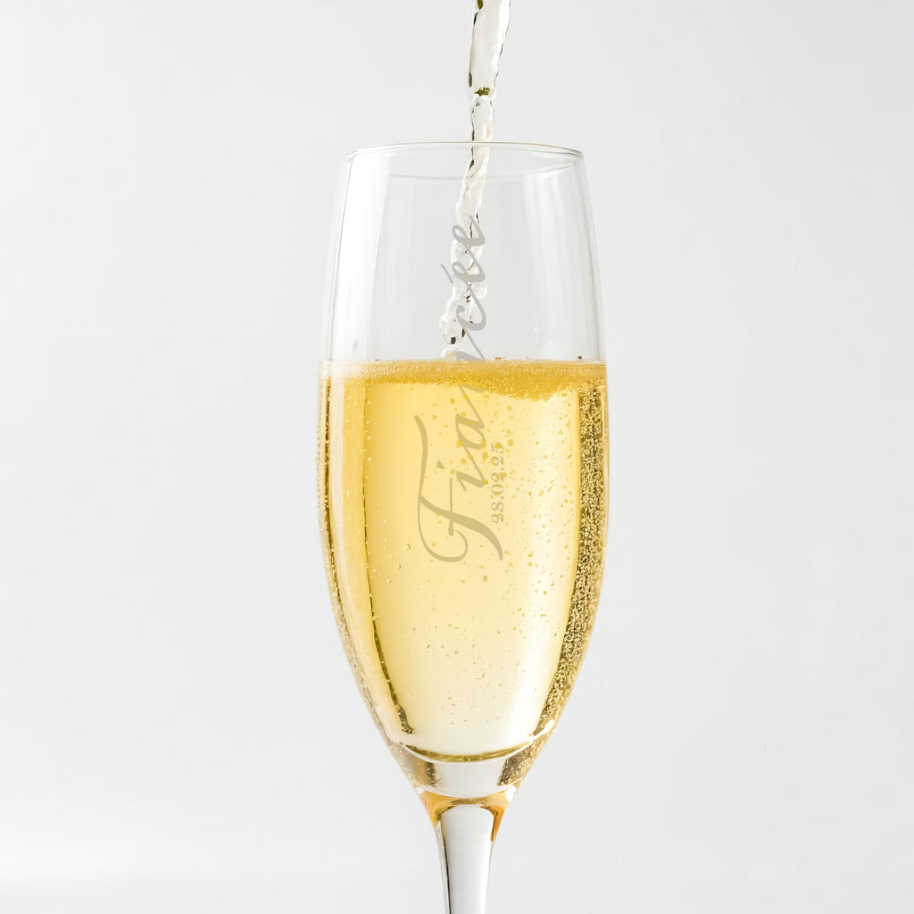 Introducing our Fiances themed Champagne Flute Pair - a simply elegant set perfect for celebrating life’s most special moment, their engagement. These beautifully simple script design champagne flutes add a touch of sophistication to the celebration. Crafted from premium glass and expertly personalised, these flutes are not just drinkware, but cherished keepsakes that you can treasure for years to come.