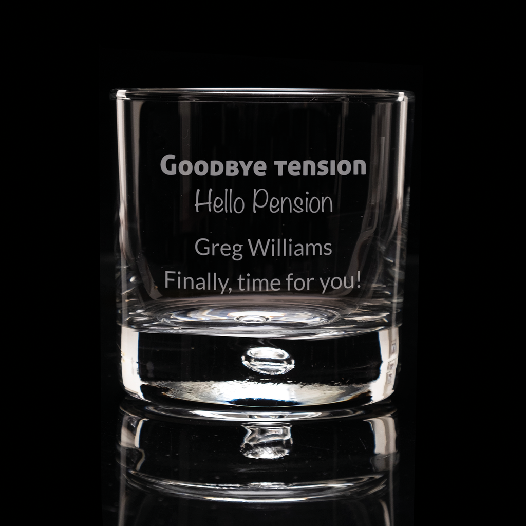 Introducing our personalised cracking tagline "Goodbye Tension, Hello Pension" personalised whiskey glass; perfect for the retiree welcoming the opportunity of less stressful days. Add their name and a personalised message to make a Retirement Glass as unique as the recipient.