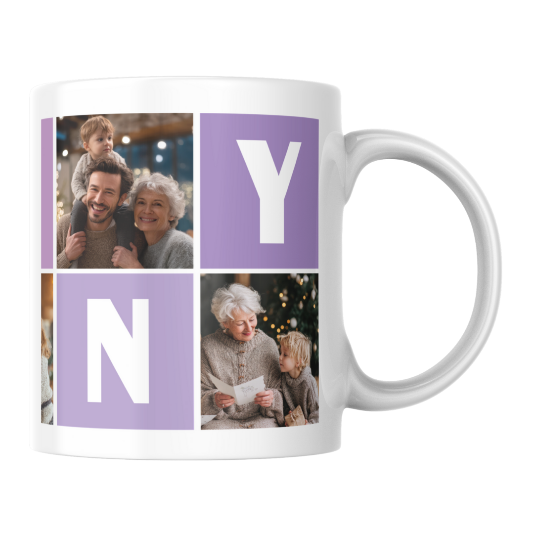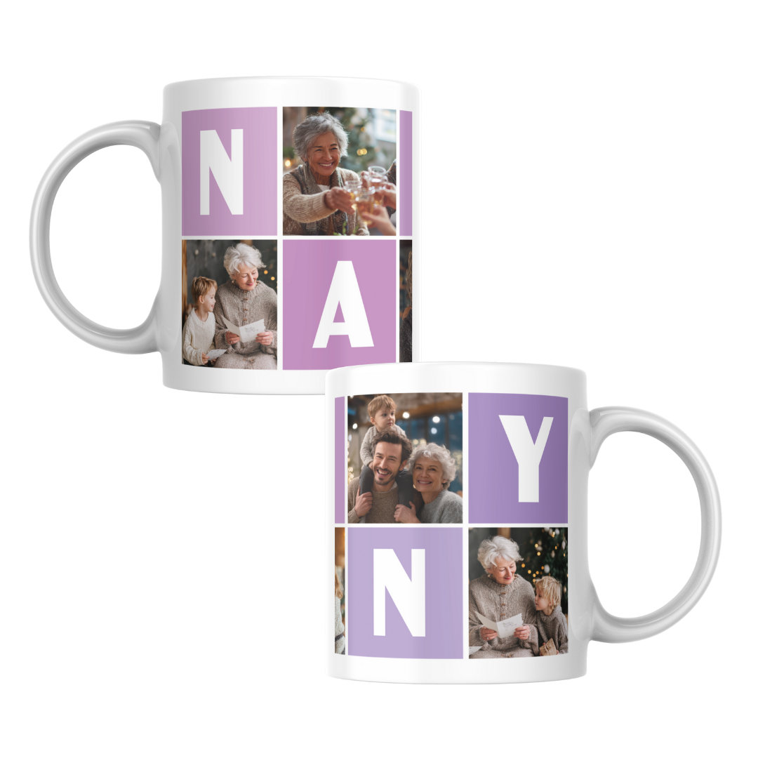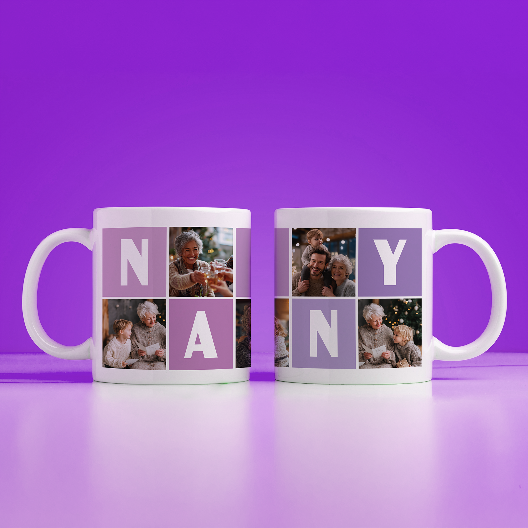 Personalised Photo Collage Mug For Nanny - With Five Photos. You choose the five photos to personalise this collage mug, making it a truly unique and thoughtful gift for any time of the year.