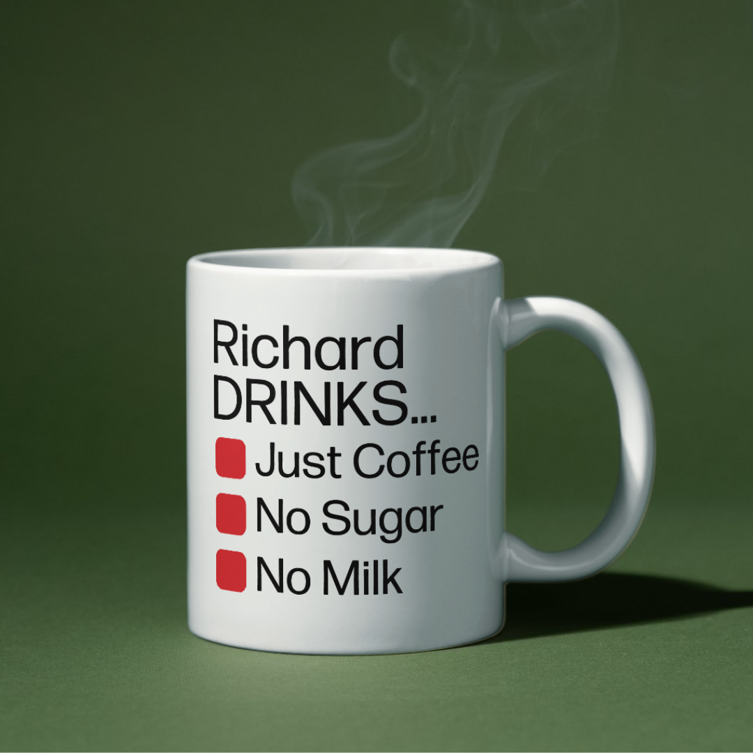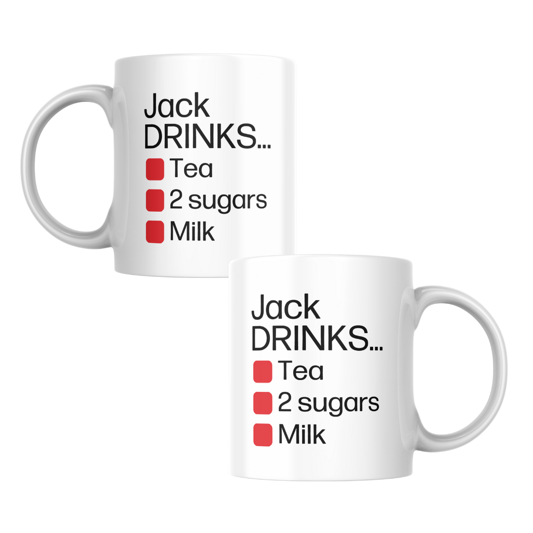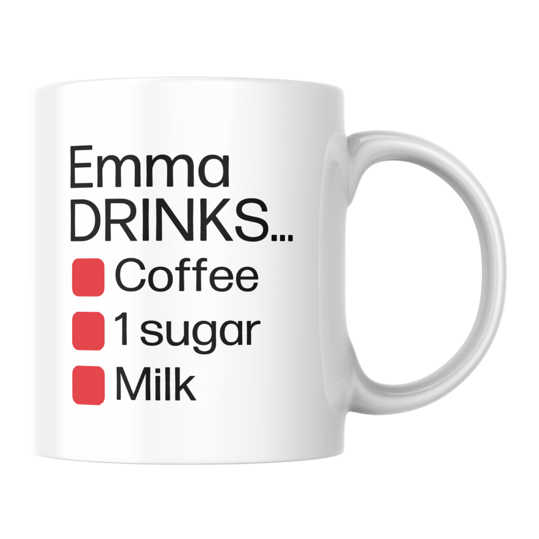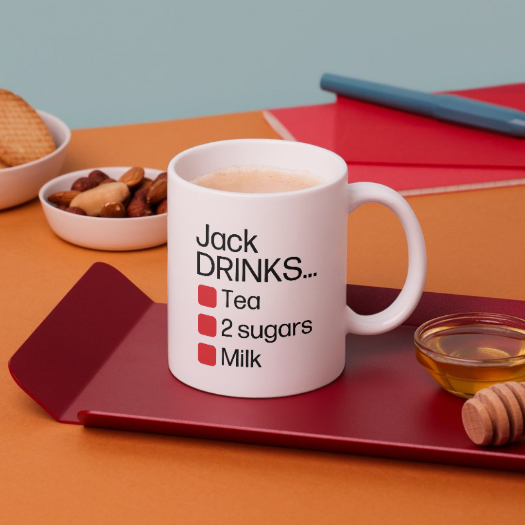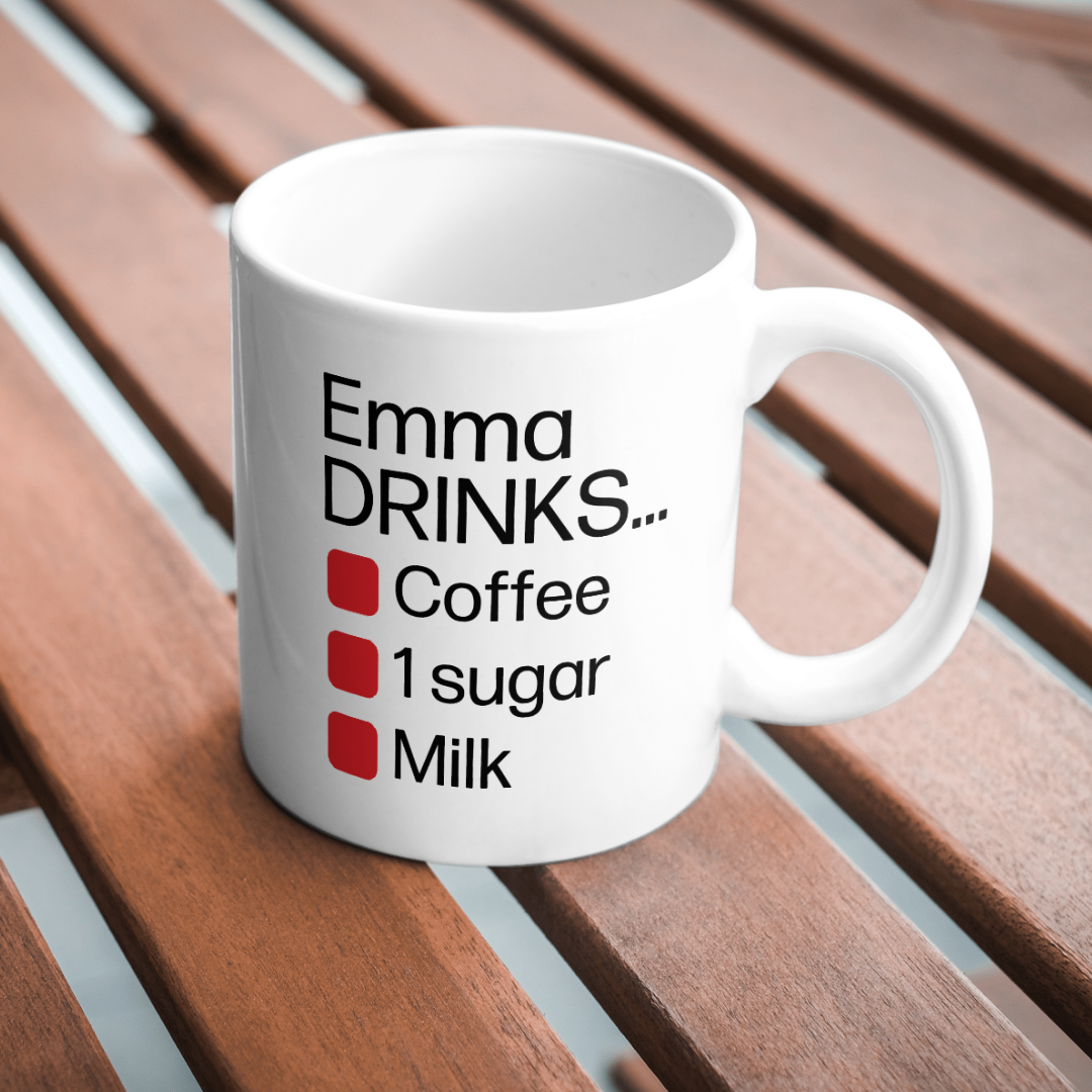 Does the company brew maker forget yours or your colleagues drinking preference daily? With our Personalised Drink Order Menu, you can personalise this with the Name of the Drinker along with three things to accompany their brew, so whether you want a Personalised Tea Cup or a Customised Coffee Cup, this mug covers all your drinking options.