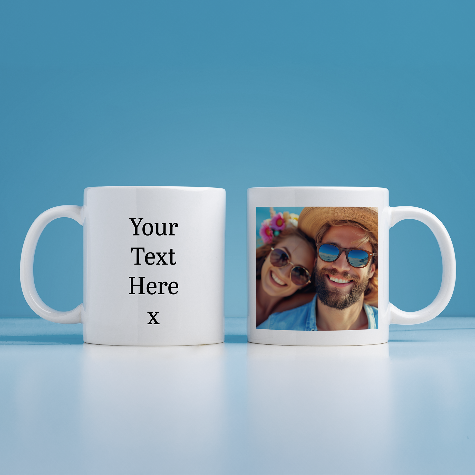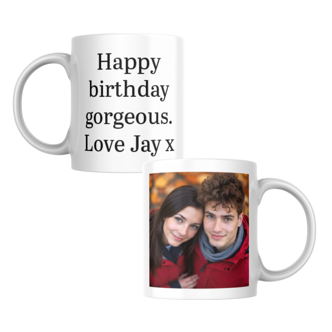 Personalised photo and message mug - Upload a photo of your choice on one side of the mug, then up to four lines of your own personalised text on the other side. With any photo and any text you can create a mug to fit any recipient, for any occasion!