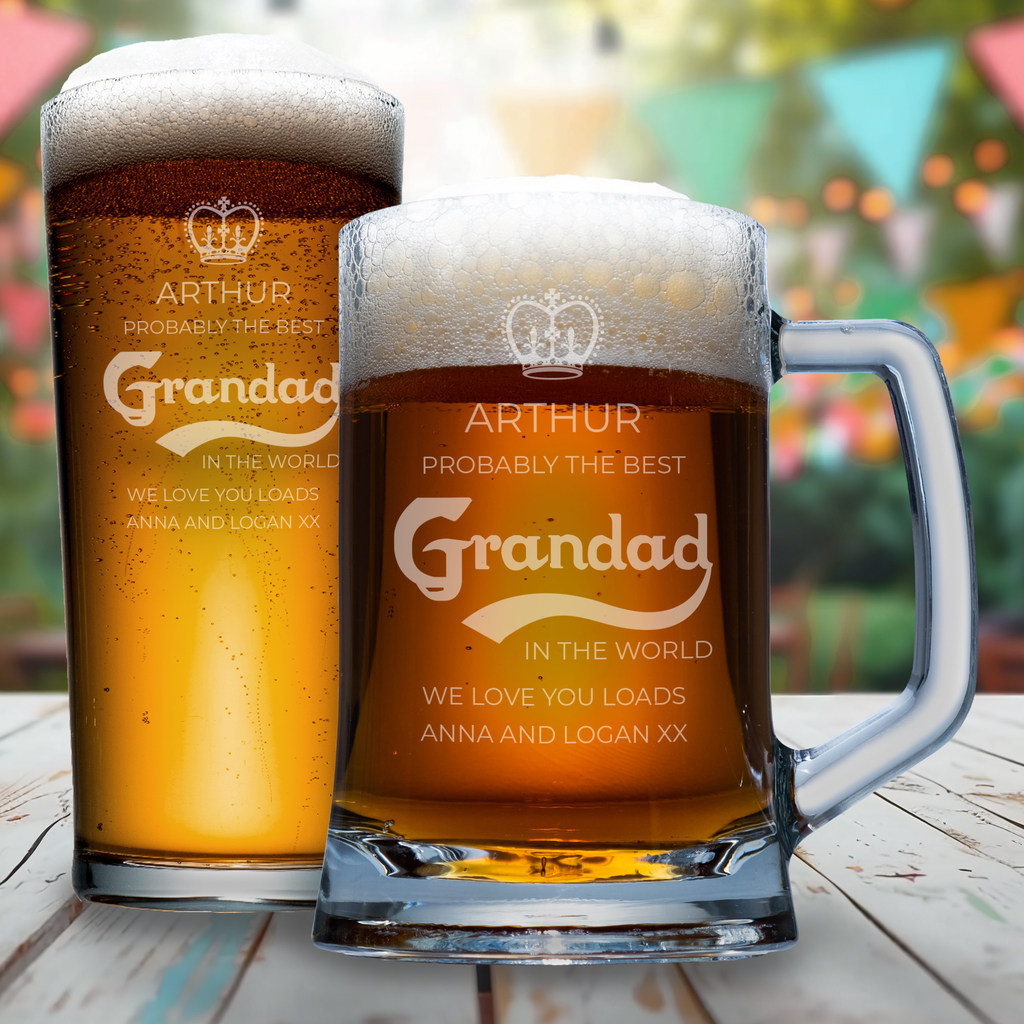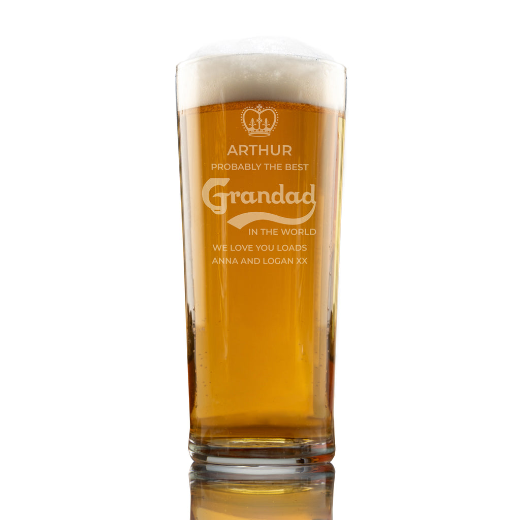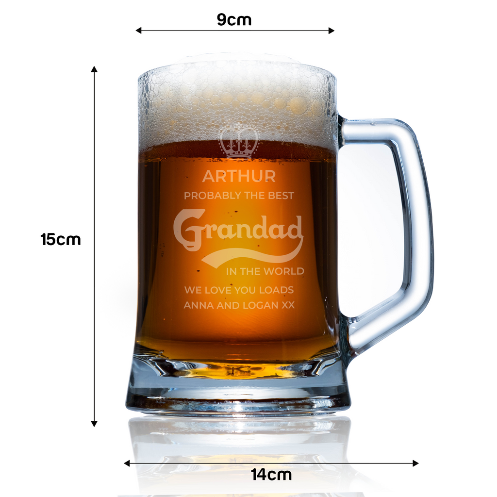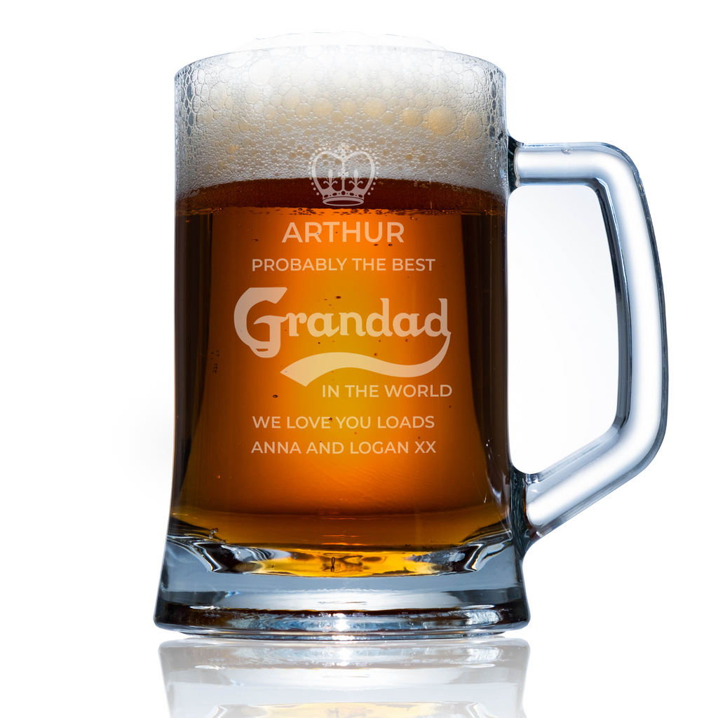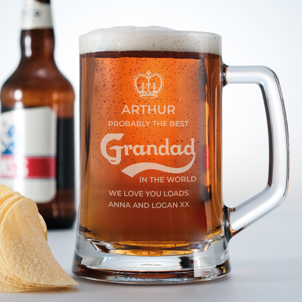 Introducing our "Probably The Best Grandad In The World" larger themed personalised glass. This design is available engraved onto a pint glass or a tankard glass, making it a perfect choice for larger and beer drinkers alike.